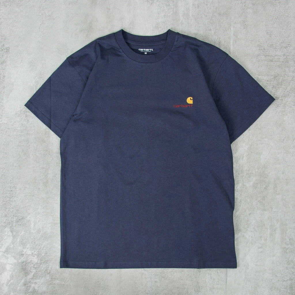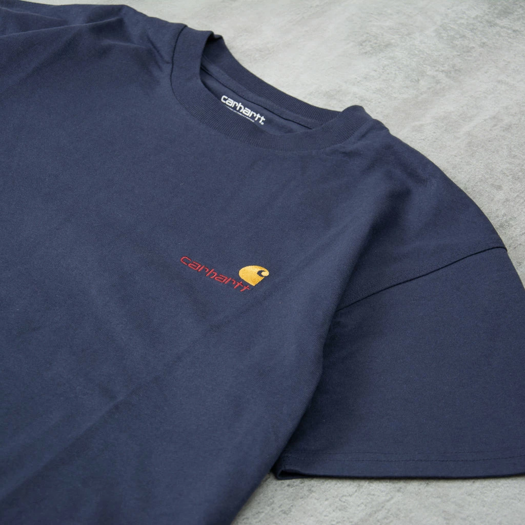 The Carhartt American Script Tee is a plain T-Shirt with minimal branding. It features a small embroidered logo on the chest.