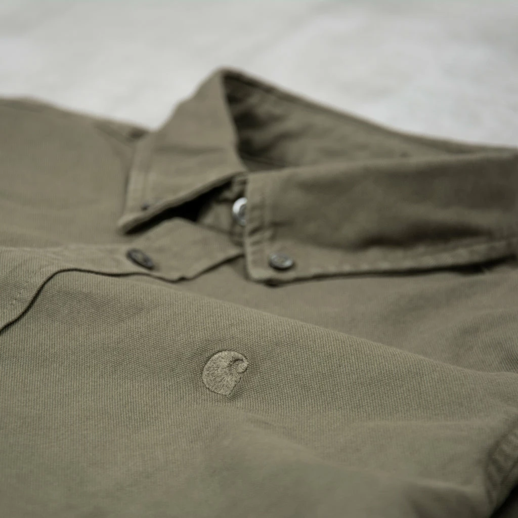 Carhartt WIP Bolton L/S Shirt – a classic button-down style and has been woven from Oxford cotton in a regular fit, and features a curved hem. It has been garment-dyed resulting in a subtle variation in color throughout and a softer feel. It is finished with a button-down collar and subtle embroidered Carhartt WIP ‘C’ Logo at the chest.