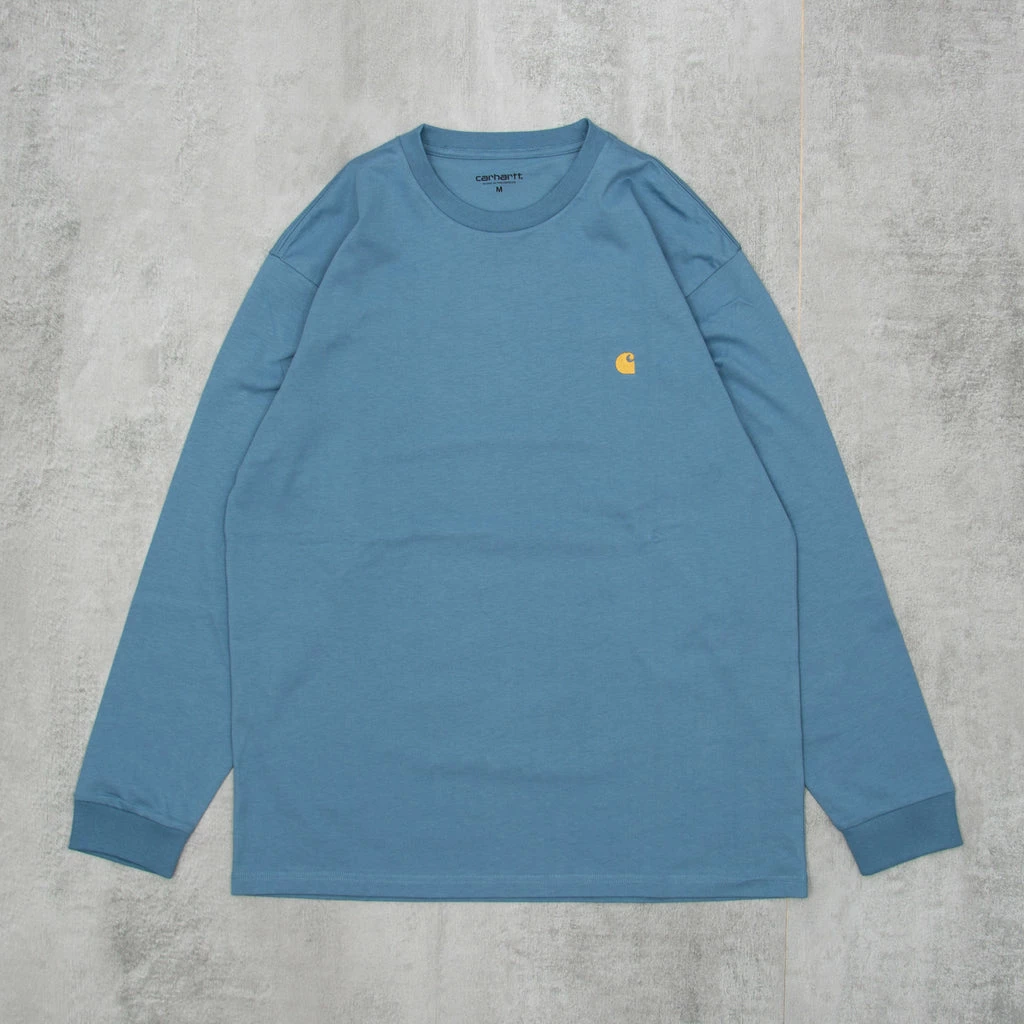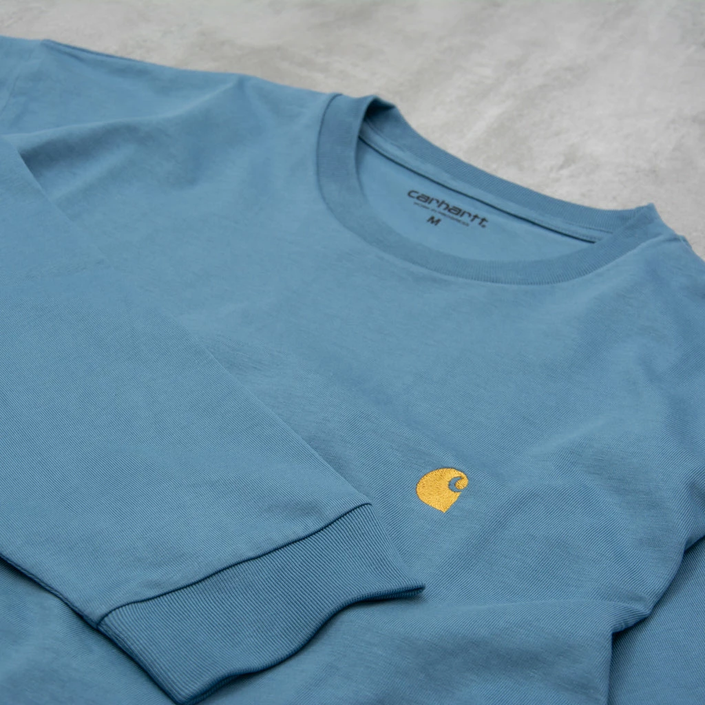 The Carhartt L/S Chase T Shirt Icy Water/Gold is a plain T Shirt with minimal branding. It features a small golden Carhartt embroidered C to the chest. It is constructed in 100% Cotton.