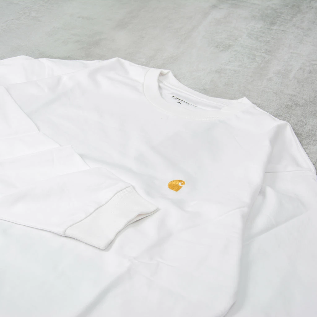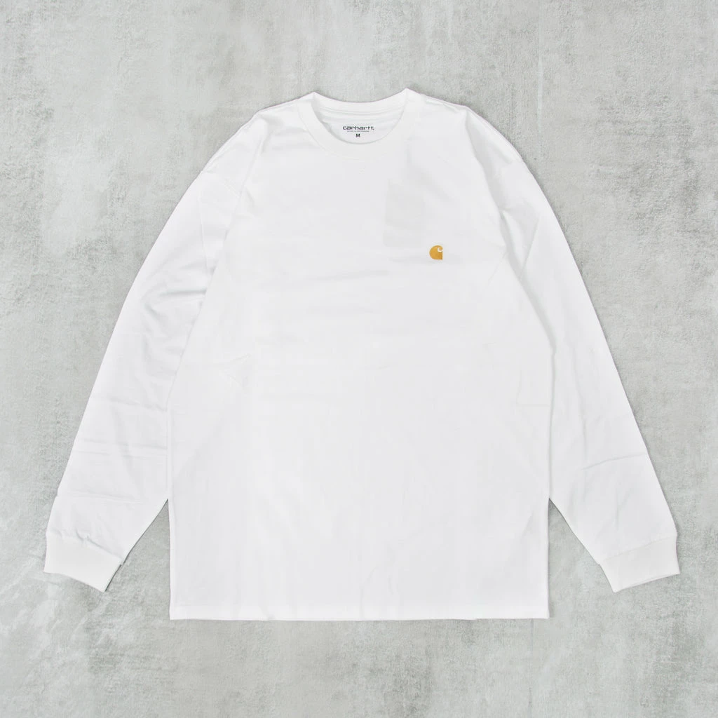 The Carhartt L/S Chase T Shirt White/Gold is a plain T Shirt with minimal branding. It features a small golden Carhartt embroidered C to the chest. It is constructed in 100% Cotton.