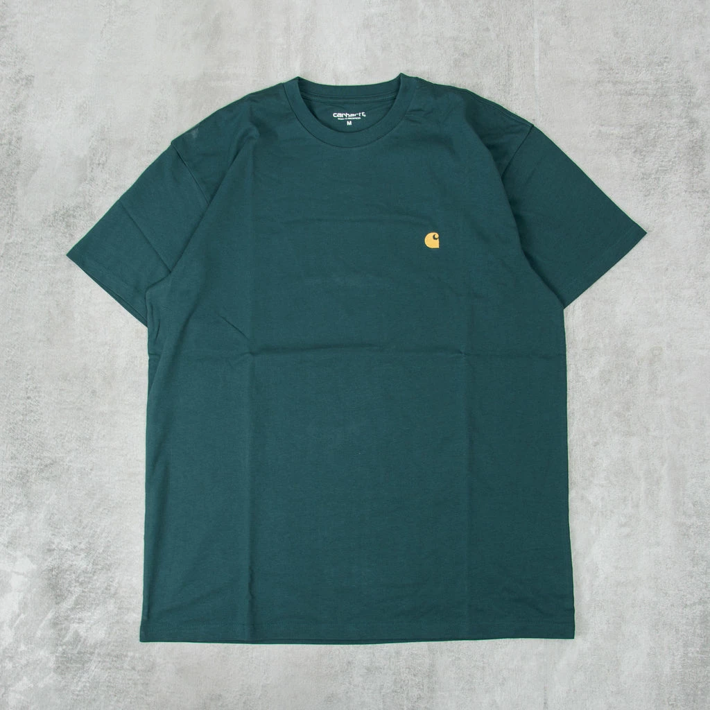 The Carhartt S/S Chase T Shirt is a plain T Shirt with minimal branding. It features a small golden Carhartt embroidered C to the chest. It is constructed in 100% Cotton.
