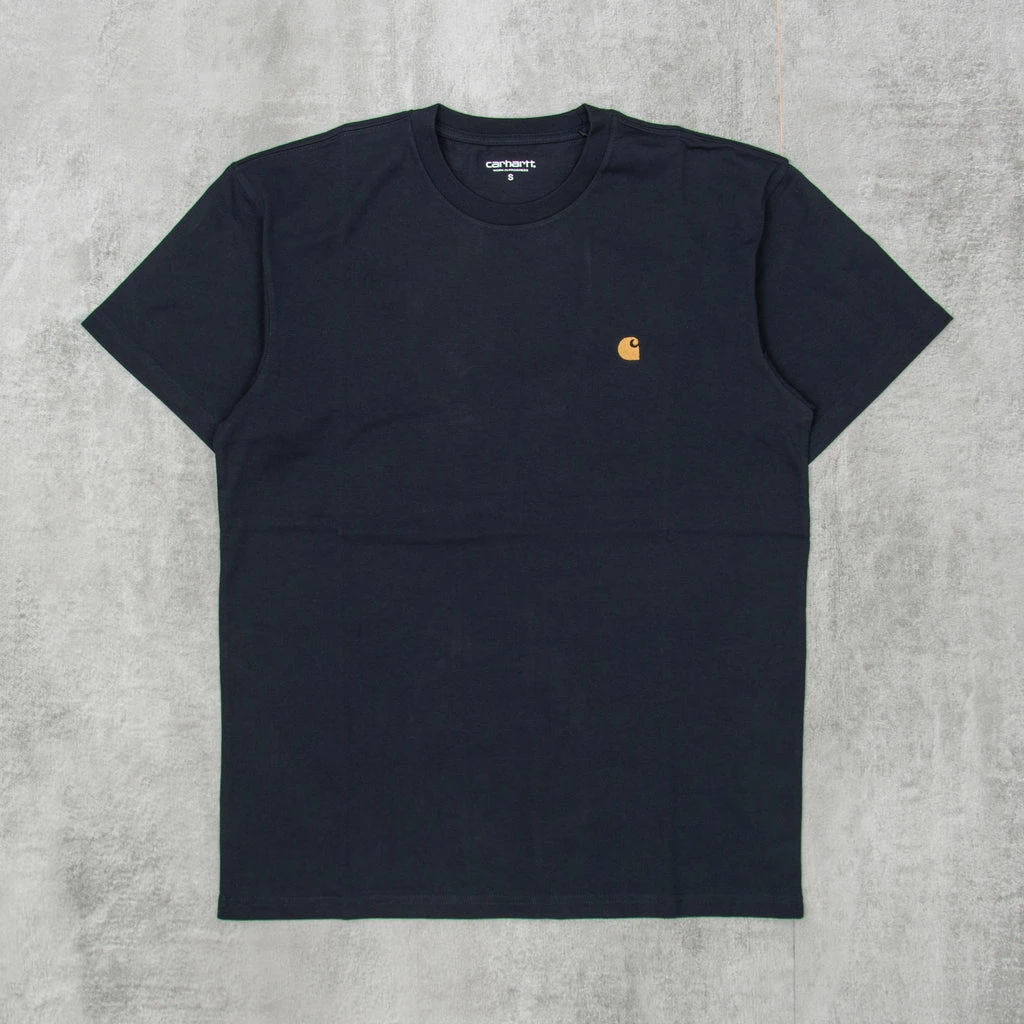 The Carhartt S/S Chase T Shirt Dark Navy/Gold is a plain T Shirt with minimal branding. It features a small golden Carhartt embroidered C to the chest. It is constructed in 100% Cotton.