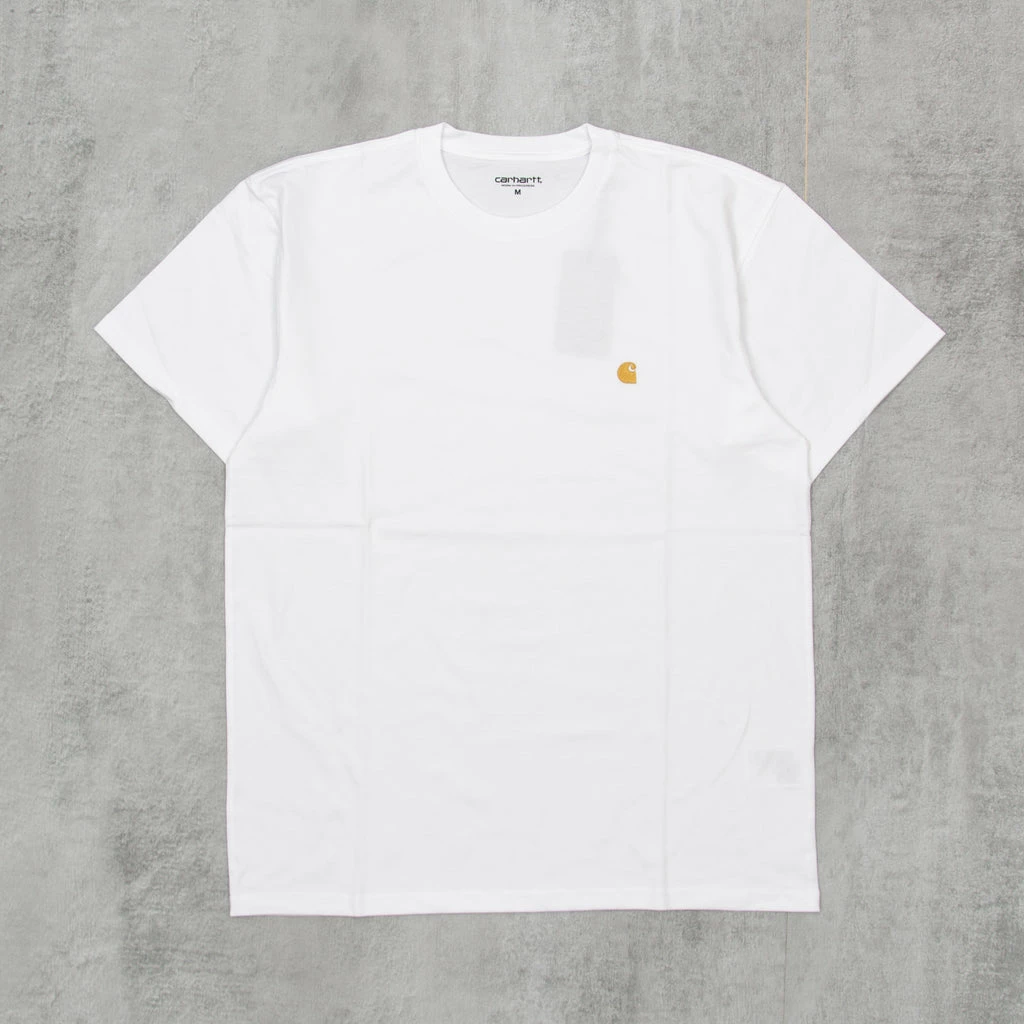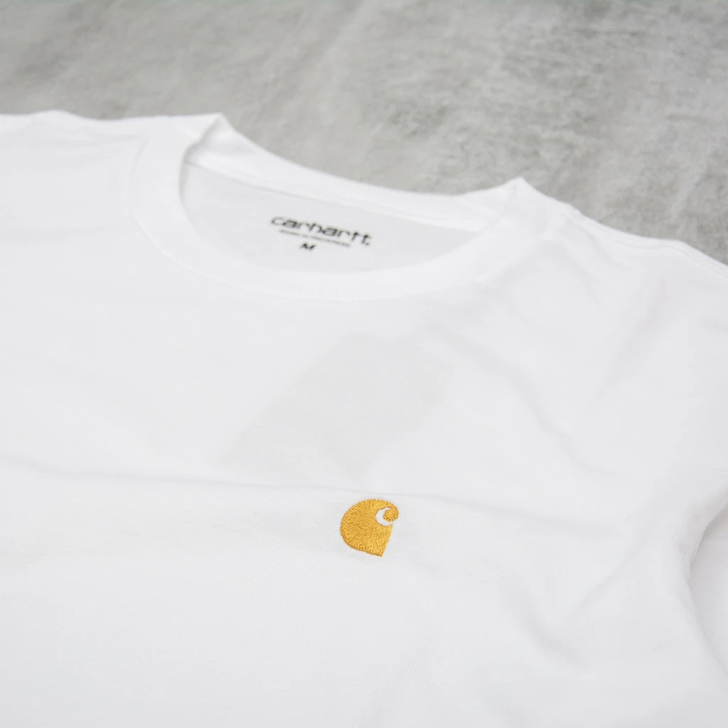 The Carhartt S/S Chase T Shirt White / Gold is a plain T Shirt with minimal branding. It features a small golden Carhartt embroidered C to the chest. It is constructed in 100% Cotton.