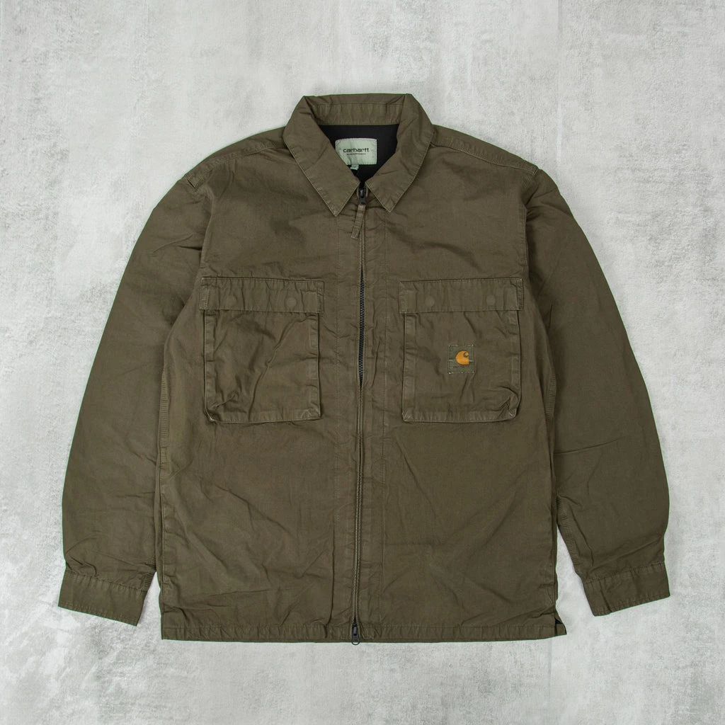 Carhartt WIP Kenard Shirt in Cypress is constructed from a lightweight cotton poplin that has been garment dyed for a more complex colour configuration. Lined inside with a breathable mesh, detailed with two chest and side pockets on the outside. A two-way zip closure and woven Square label. Loose fit.