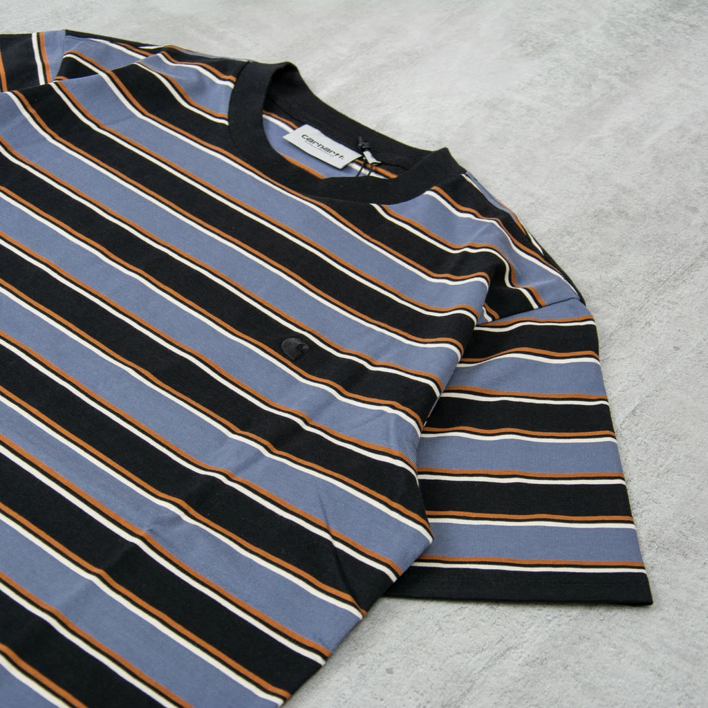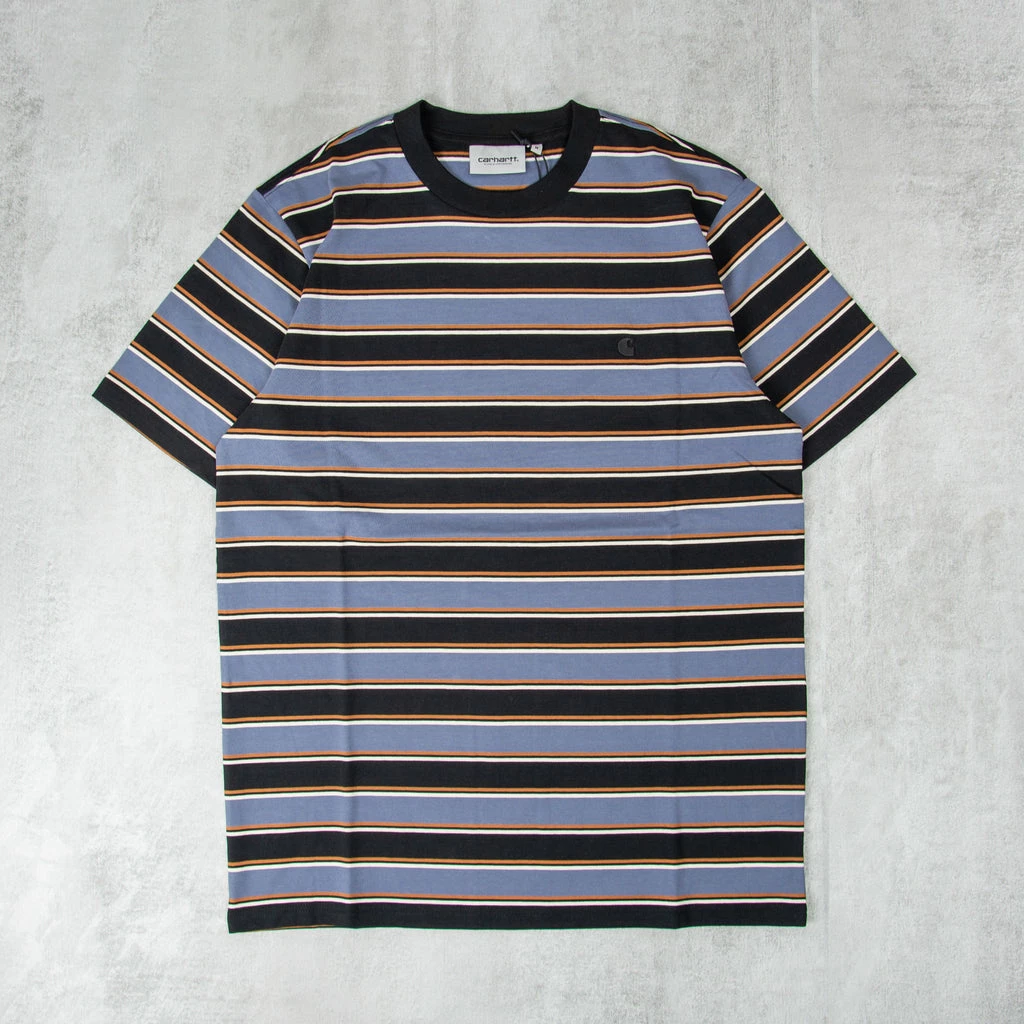 Carhartt WIP Leonne Striped Tee Woven from cotton jersey, the S/S Leone T-Shirt has a regular fit and a lightweight feel. It features a striped print and has been yarn-dyed for a longer lasting, allover stripe.