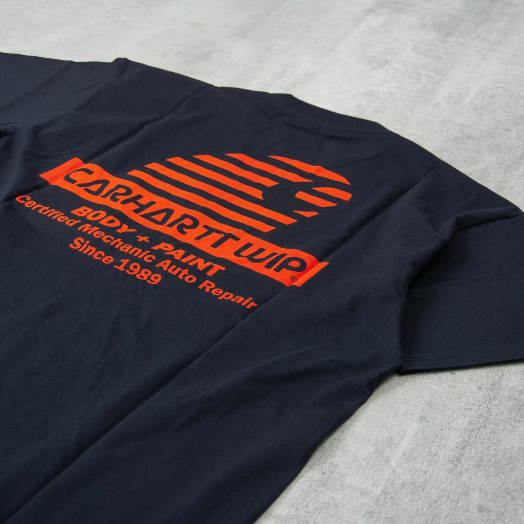 The Carhartt WIP Mechanic S/S Tee – Dark Navy / Brick is a loose fit tee cut from midweight, organic cotton jersey featuring a seasonal graphic print.