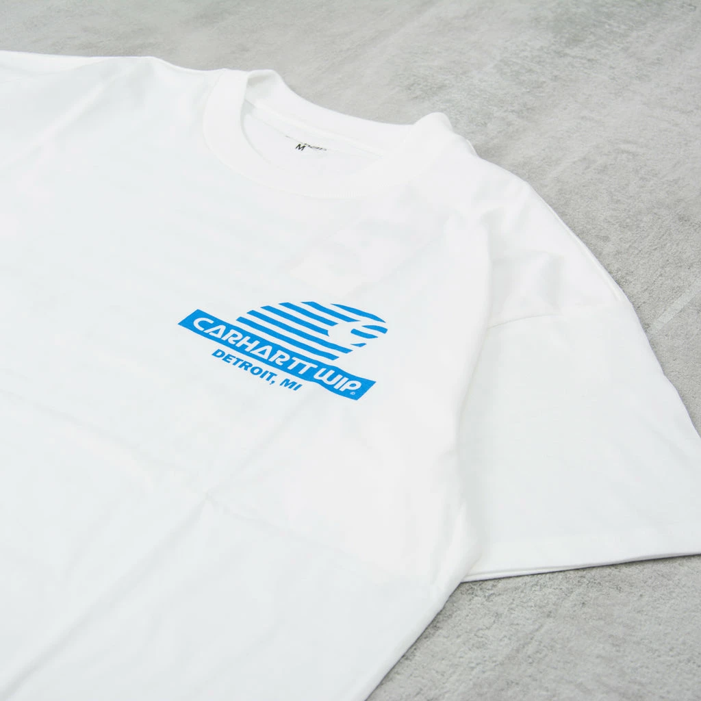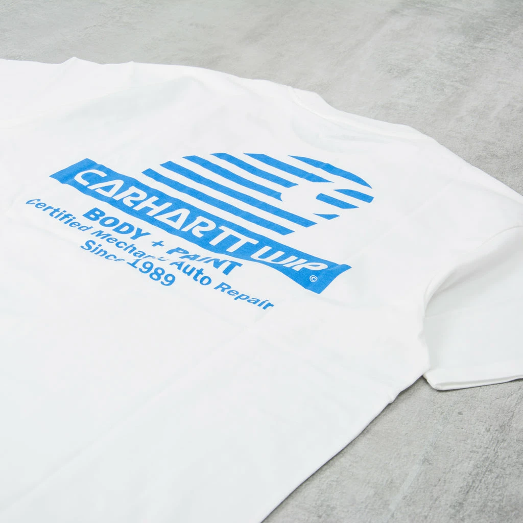 The Carhartt WIP Mechanic S/S Tee – White / Blue is a loose fit tee cut from midweight, organic cotton jersey featuring a seasonal graphic print.