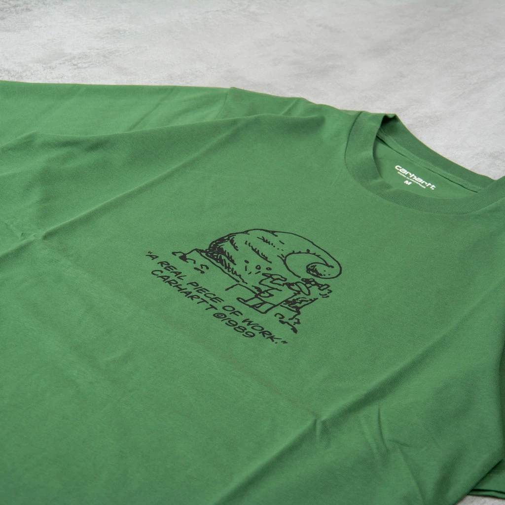 The Carhartt WIP Piece of Work S/S Tee in Bonsai is a regular fit tee cut from lightweight, organic cotton jersey featuring a seasonal graphic print.