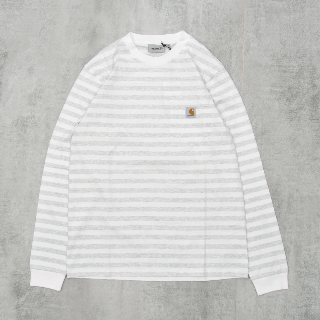The Carhartt WIP Scotty L/S Striped Tee, constructed from 100% cotton and featuring a woven label on the chest pocket.