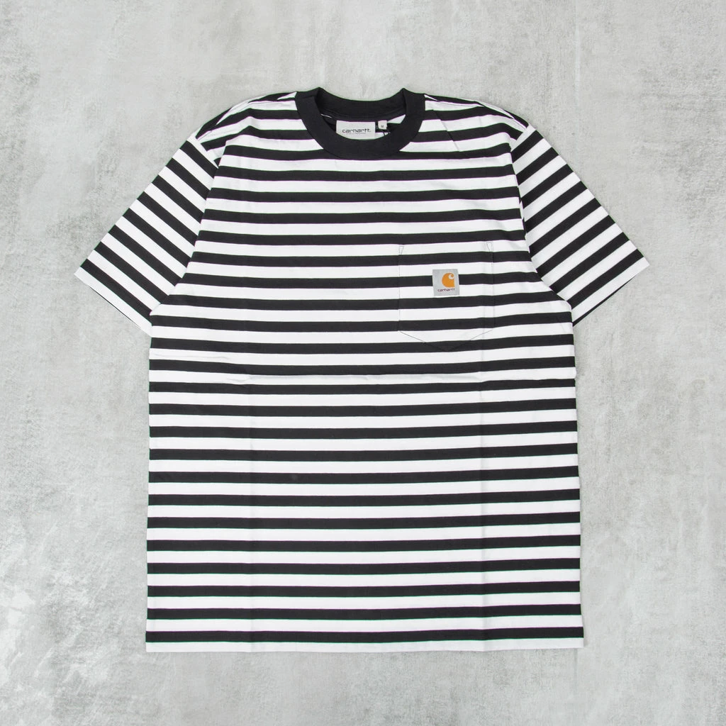 The Carhartt WIP Scotty S/S Striped Tee, constructed from 100% cotton and featuring a woven label on the chest pocket.