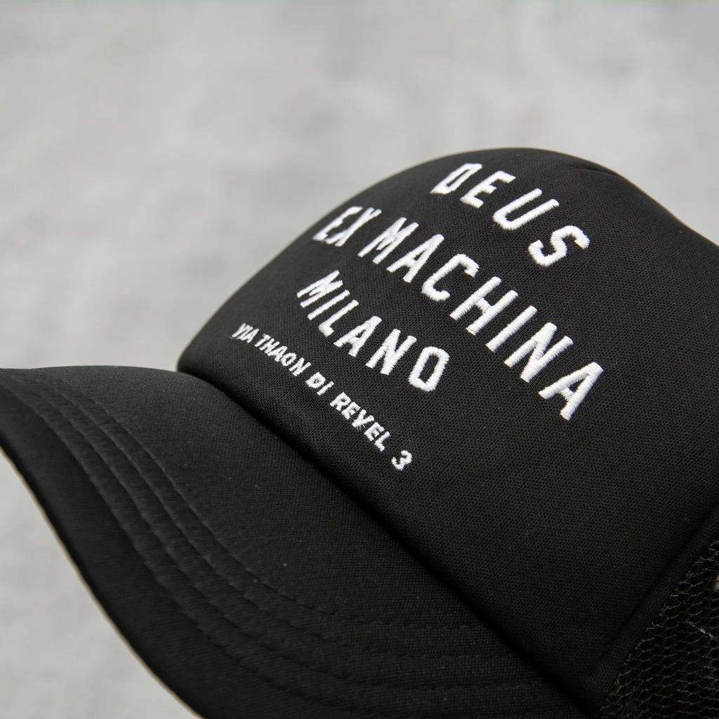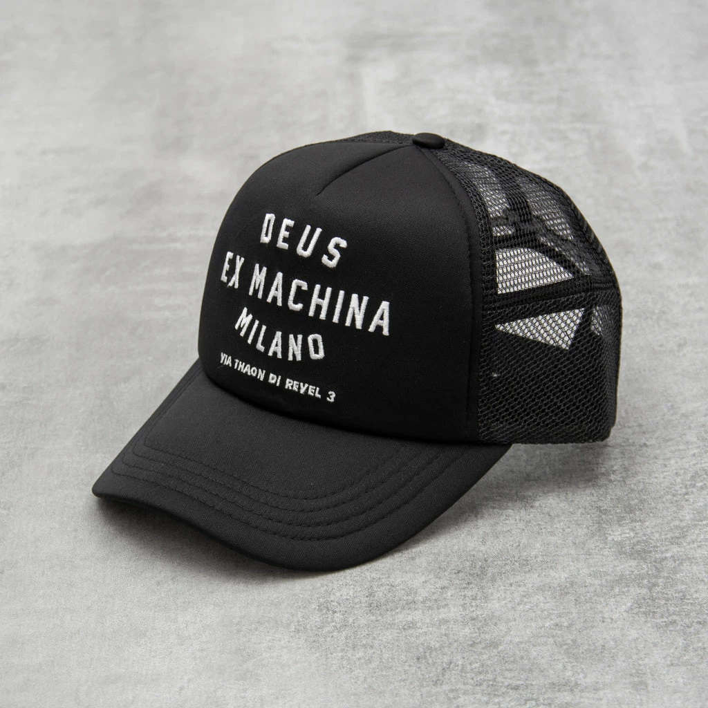 The Deus ex Machine Milano Address Trucker Cap As classic as you can get, the truckies crown. First handed out by farmers and rural types to promote their goods, the trucker cap quickly became the uniform of the highway hauler, gassy and grease monkey.