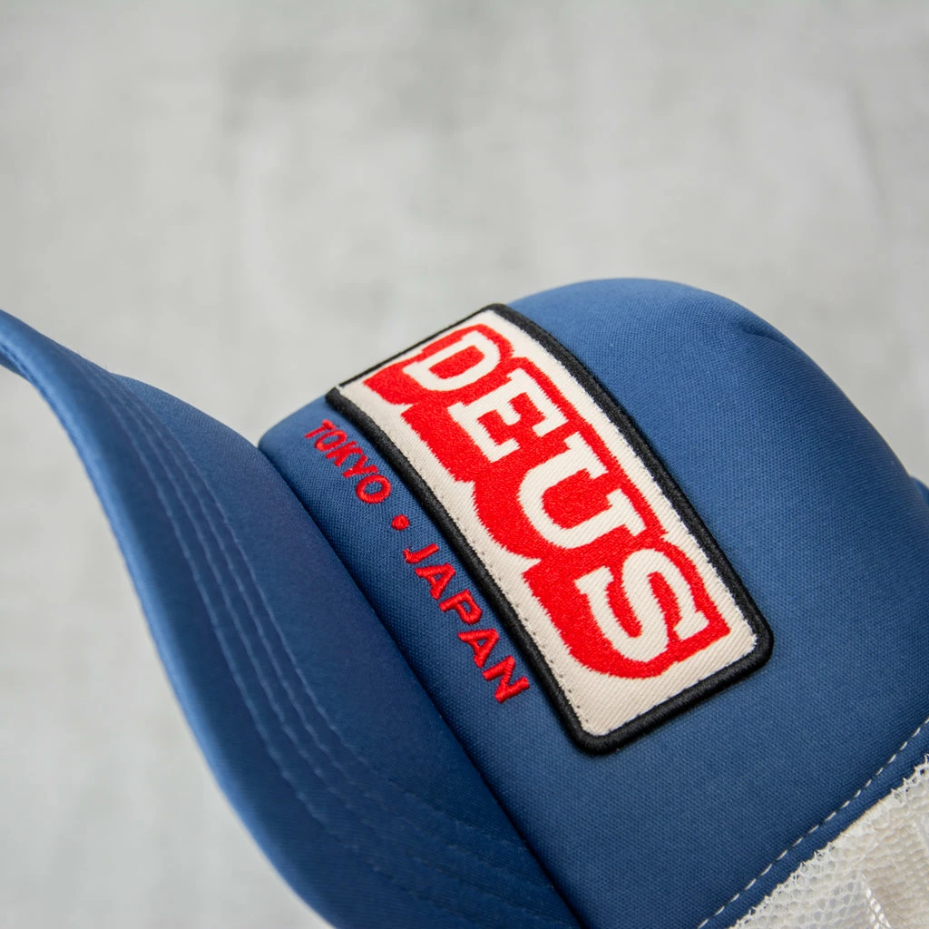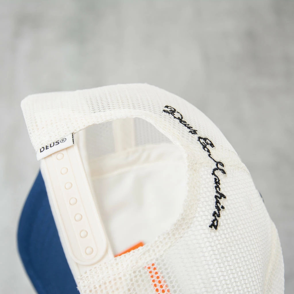 Deus ex Machina RedlineTrucker Cap This cap features a front embroidered logo of the original Deus art, as well as a back embroidered logo and adjustable plastic snap closure. It is composed of 100% polyester fabric.