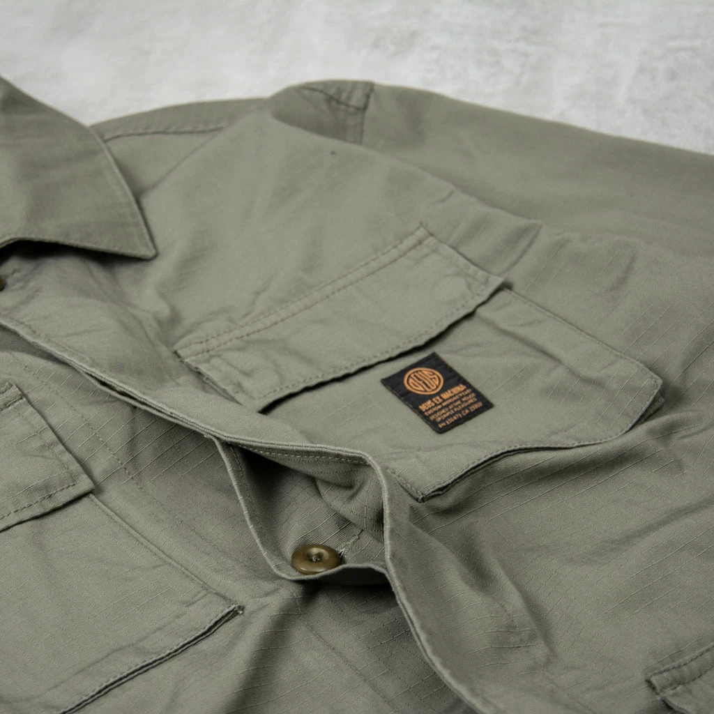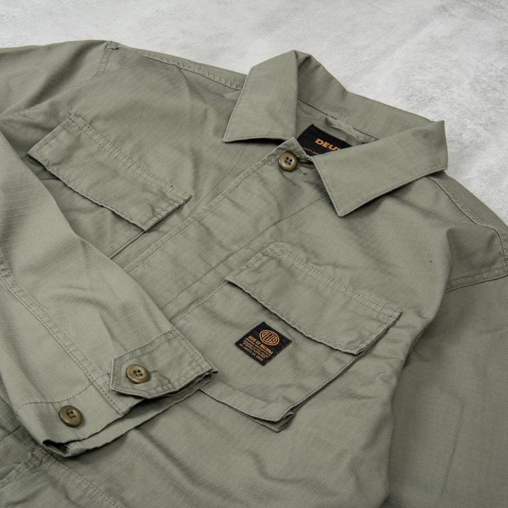 Deus ex Machina Sawyer BDU Shirt – Lichen Green This 50% Cotton 50% Poly Ripstop Fabrication overshirt features a relaxed fit and has undergone a Heavy Enzyme Stone Wash for a worn-in look.