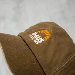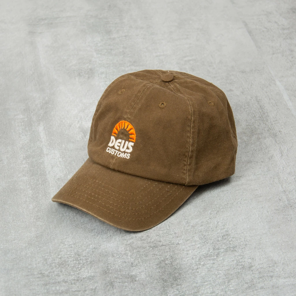 Deus ex Machina Sunrise Dad Cap in Desert Palm This classic cotton twill baseball cap from Deus Ex Machina provides an authentic vintage look, complete with a Sunrise badge embroidery and adjuster to the rear. With its 6-panel structure, this cap offers an adjustable fit and a timeless aesthetic.