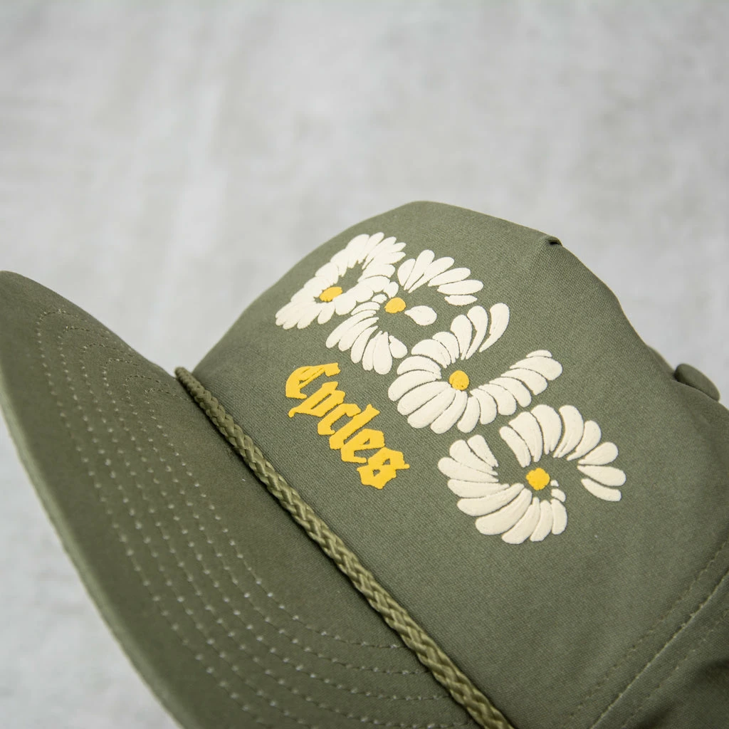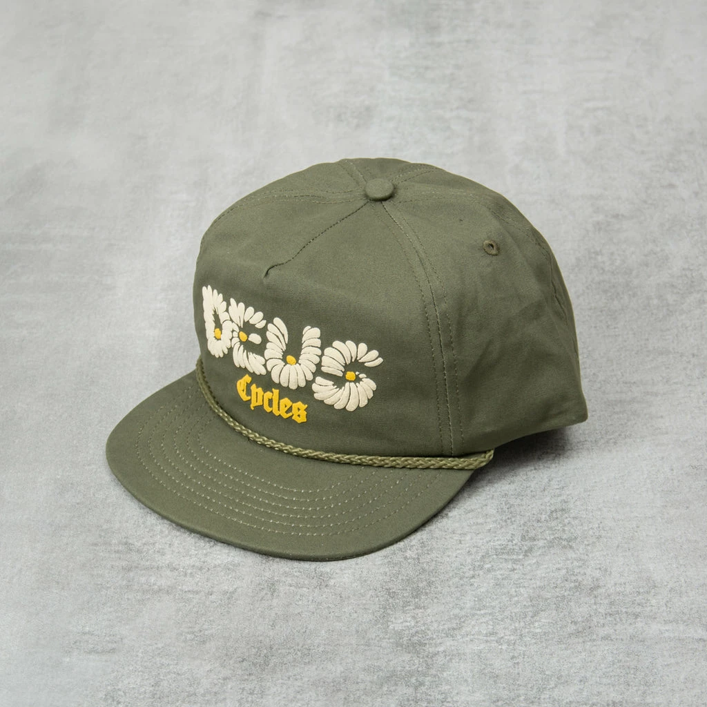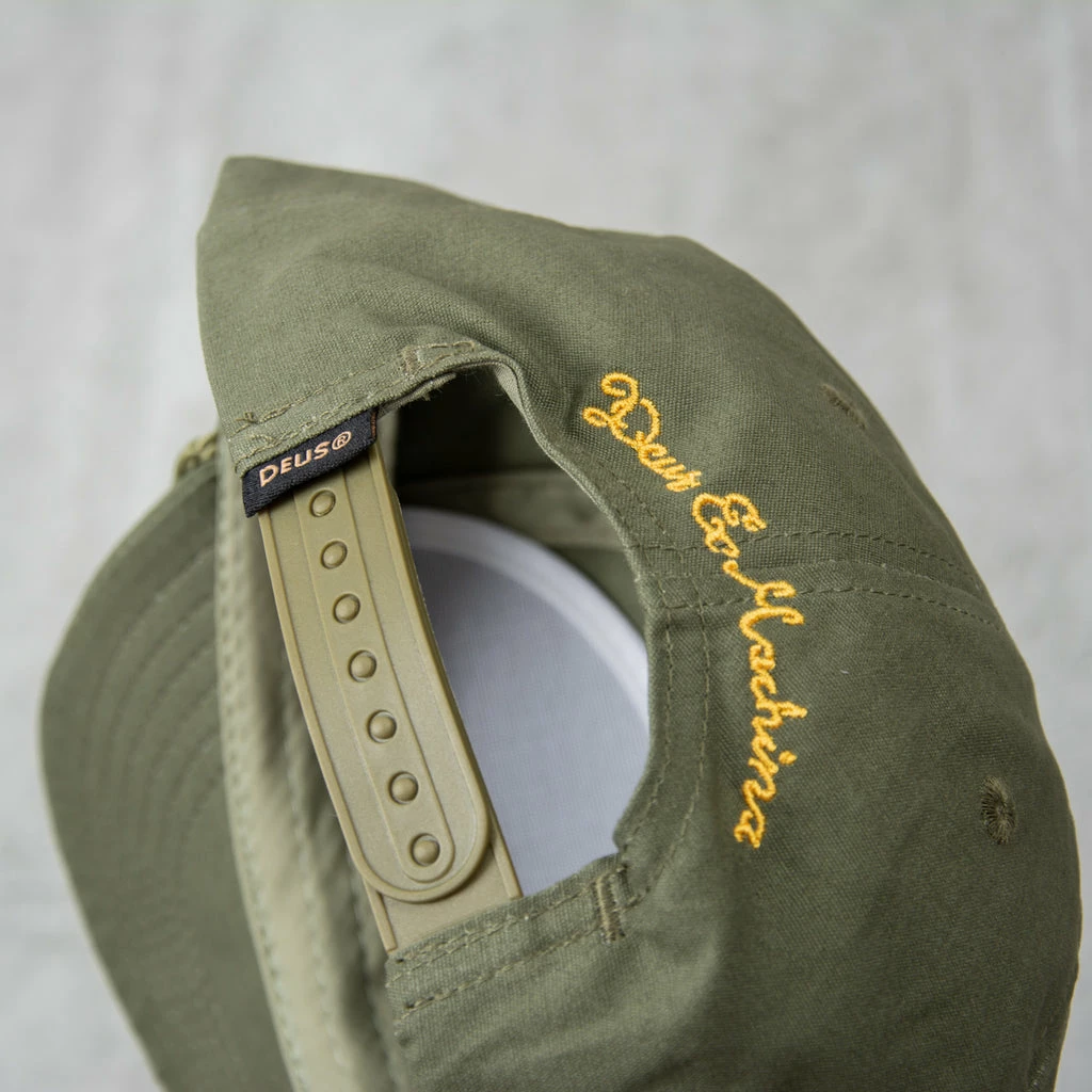 Deus ex Machina Tangerine Cap in Capulet Olive – Cotton trucker cap features decorative detail on visor, front puff print, back embroidered logo, and plastic snap adjuster.