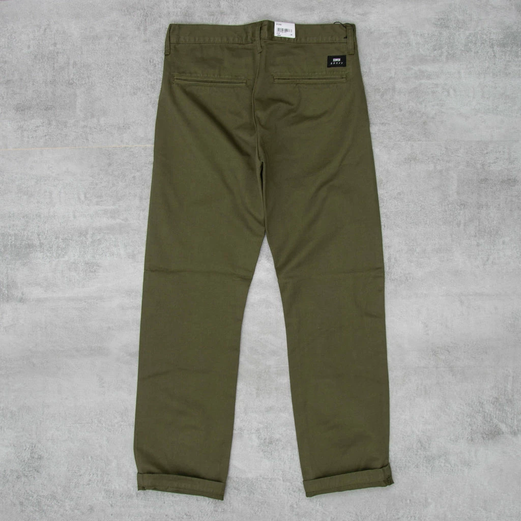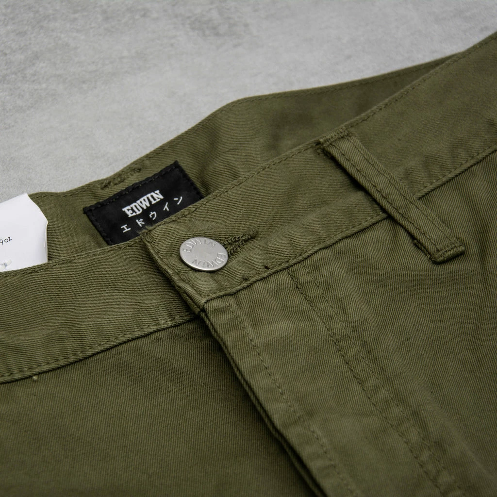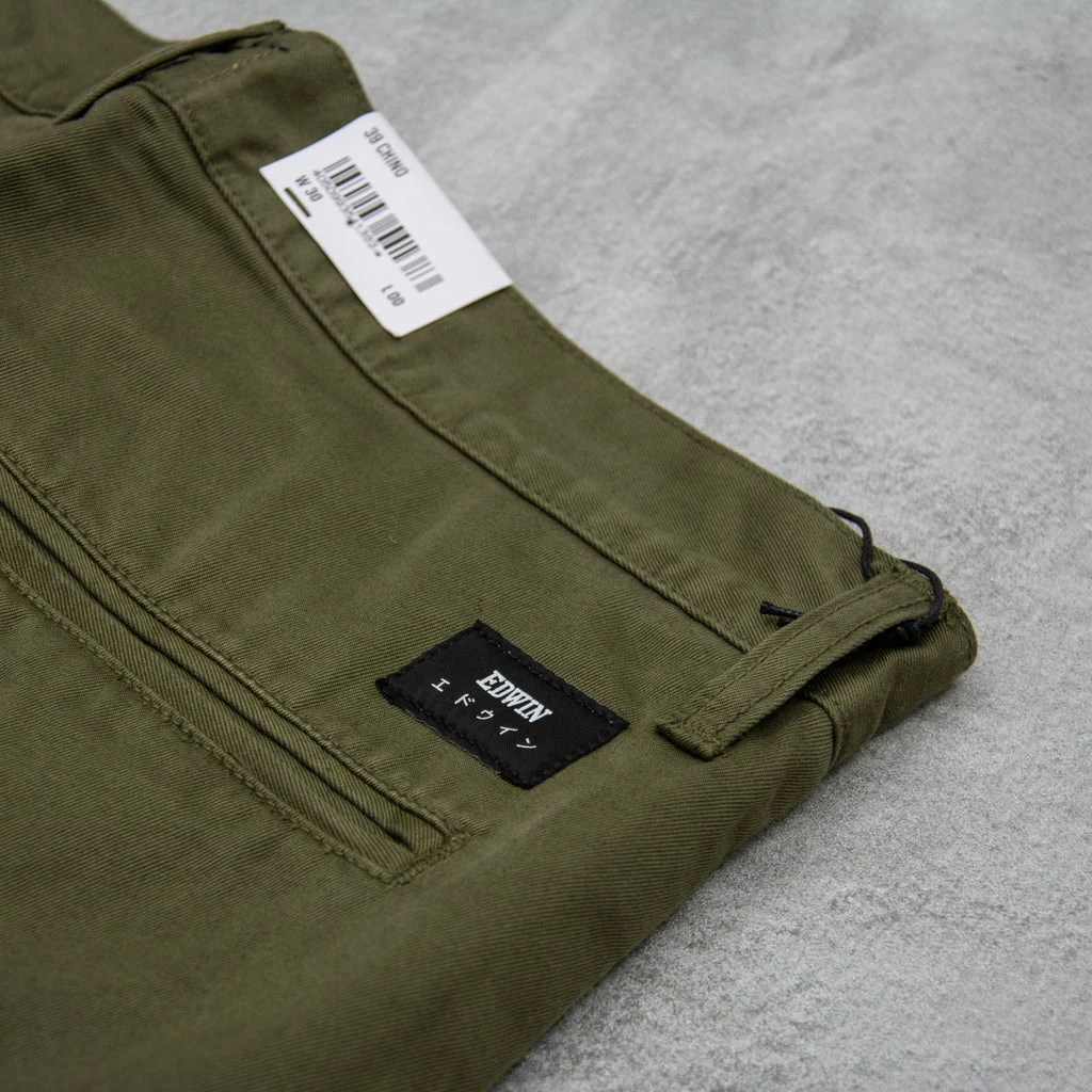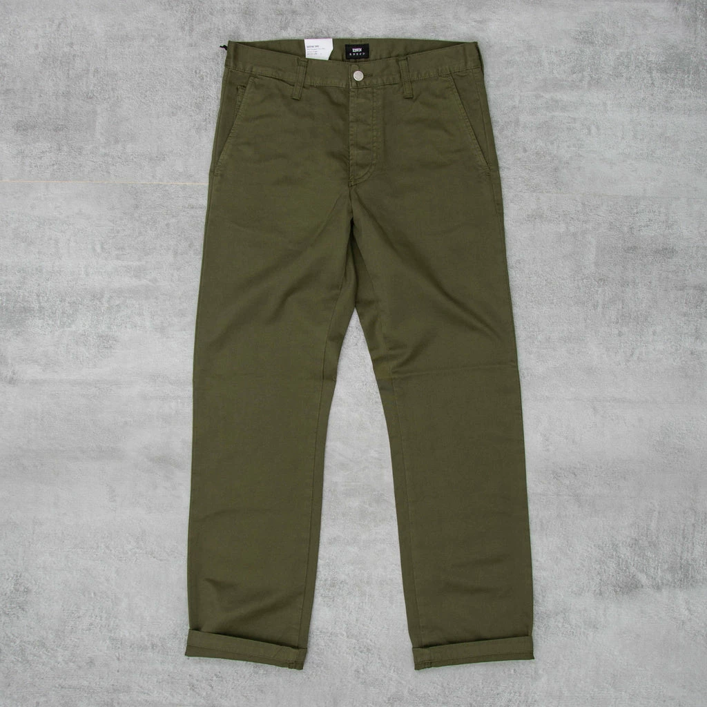 The Edwin 39 Chino is a compact twill pant in a 9oz fabric. A regular loose fitting mid rise design, the garment dyed Martini Olive finish is sure to age well with every wear. The leg length is cut a standardised length.