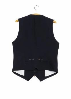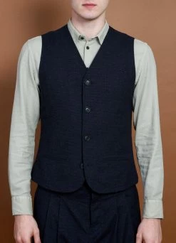 Kalle is a 6-button classic suit vest with pointed fronts, a buckle back, and paspel pockets. It’s lined with organic cotton from Italy, and it has an inside chest pocket. The darts on front create a shaped fit.
