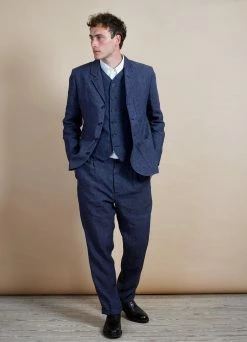 The lightweight Italian fabric is made from yarn dyed 100% linen. That means it’s naturally wrinkled, and ideal for the summer. The délavé fabric has an uneven colour, which is made by washing the yarn before it’s woven.
