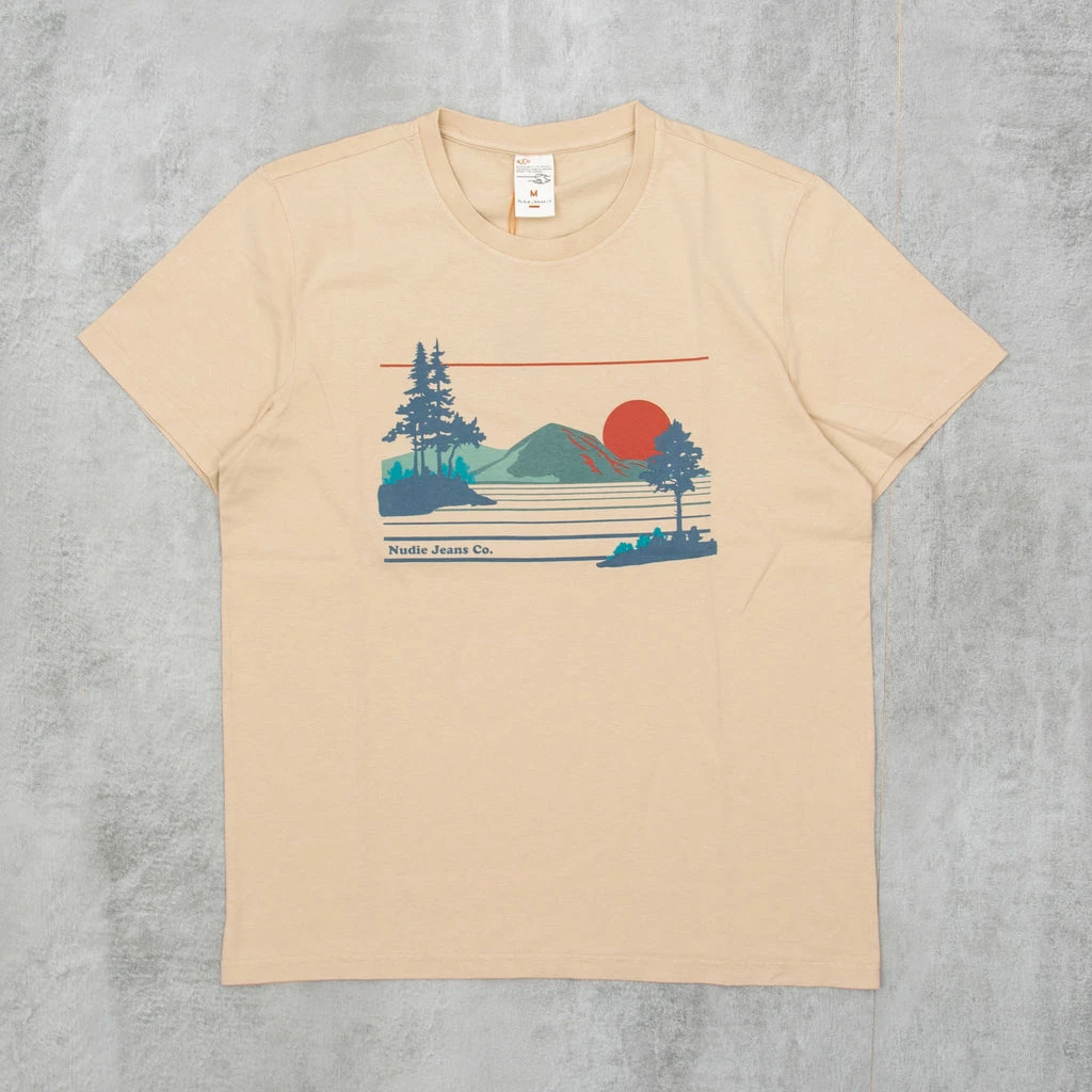 The Nudie Roy Sunshine Ark S/S Tee in Faded Sun is a crew neck T-shirt made from an organic cotton featuring a retro print, the beautiful shade results from the pigment-dying process and garment stone wash.