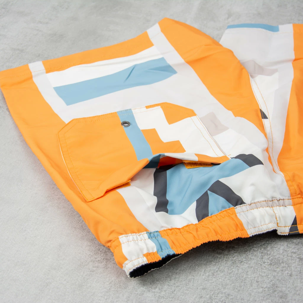 The Penfield Geo Print Swim Short This classic swim short features Penfield’s signature nylon crinkle fabric, making it lightweight and packable for easy carrying. Constructed with contrast colour internal waistband, side seams pockets and an off white drawcord. Additionally, the branded eyelets and aglets are an added touch to the statement seasonal geo print.