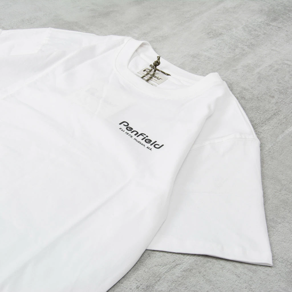 The Penfield Hudson Script Tee is a classic short-sleeved T-shirt for men, crafted from high-quality 100% cotton for enhanced durability and comfort. Its ribbed crew neck collar and p bear side tab offer a unique aesthetic, while the statement chest print logo to the left chest complements the classic look.