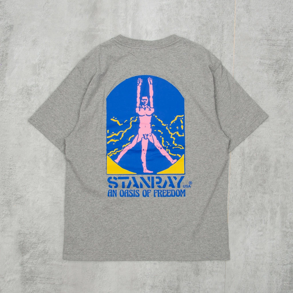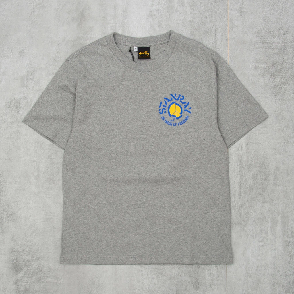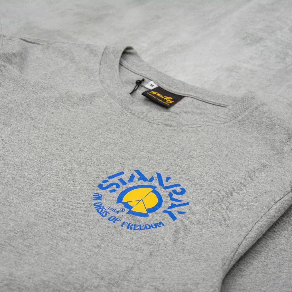 Stan Ray Oasis of Freedom Tee in Grey Heather is a premium 220gsm short sleeve pocket tee with screen print at front left chest & Large Back print, 2×1 rib collar.